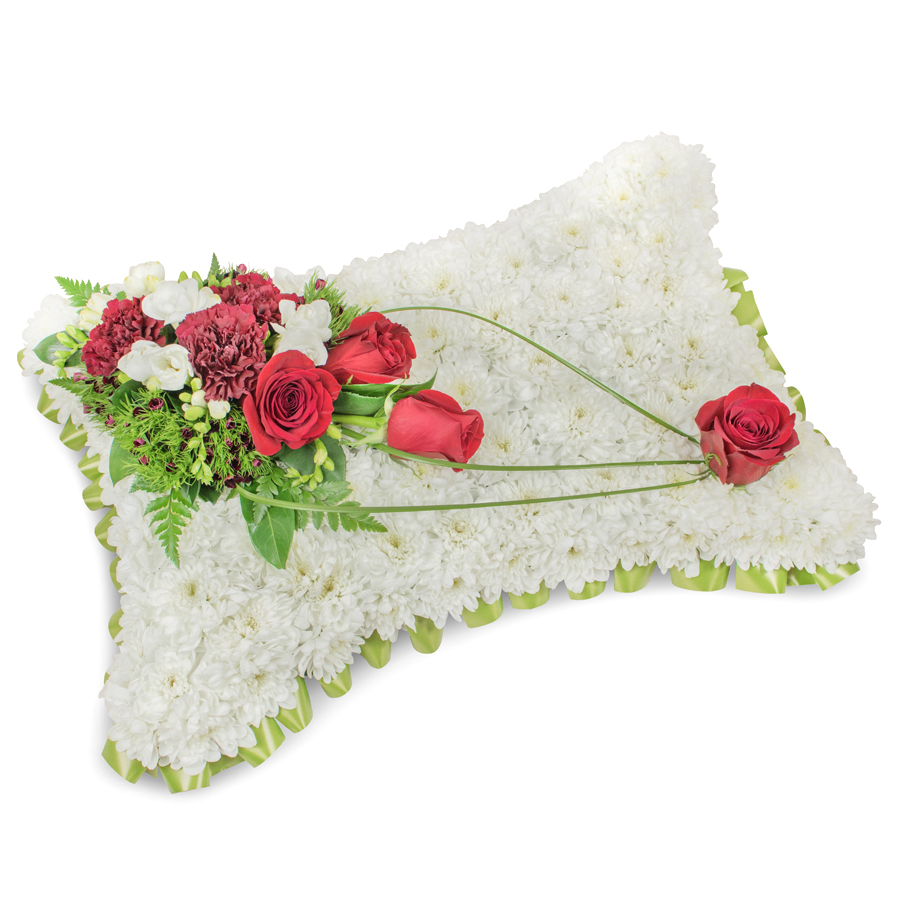 Express your deepest sympathies with our timeless sympathy bouquet. This elegant arrangement features a harmonious blend of white chrysanthemums, vibrant red roses, white freesias, and dark red carnations, beautifully enhanced by dianthus and bear grass for a unique and heartfelt display.